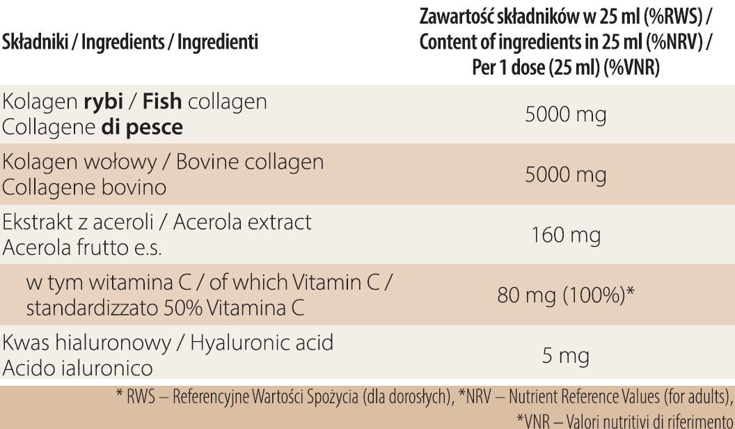 Sudedamosios dalys: vanduo, žuvų kolagenas, jautienos kolagenas, koncentruotos obuolių sultys, apelsinų sultys, glicerinas, kvapiosios medžiagos, acerolos vaisių ekstraktas 25:1 (Malpighia glabra L.) standartizuotas iki 50 % vitamino C, citrinų sulčių koncentratas, rūgštingumą reguliuojanti medžiaga (citrinų rūgštis), konservantai (kalio sorbatas, natrio benzoatas), dažiklis (beta karotenas), saldiklis (sukralozė), hialurono rūgštis (natrio hialuronatas).